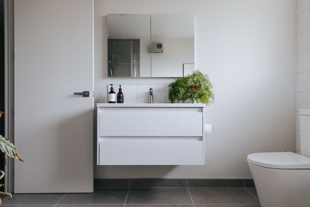 - A two-drawer wall-hung vanity was fitted and supplied with a recessed mirrored cabinet installed above, both finished in white. The vanity’s location discretely screens a back-to-wall free-standing toilet suite. All fixtures were fitted with chrome tapware.