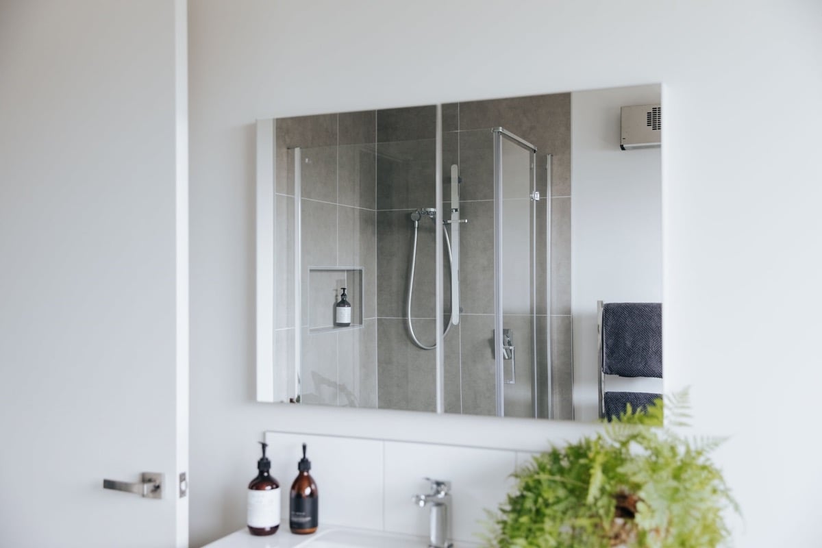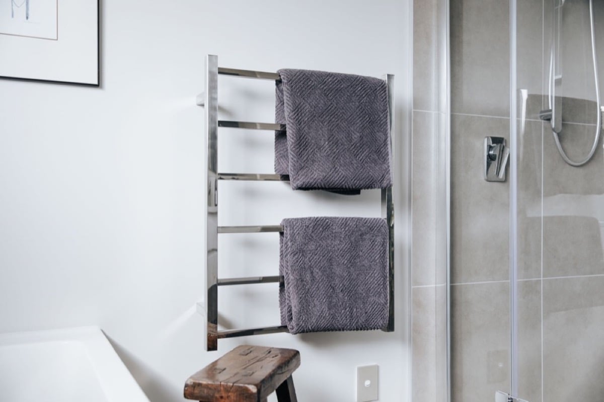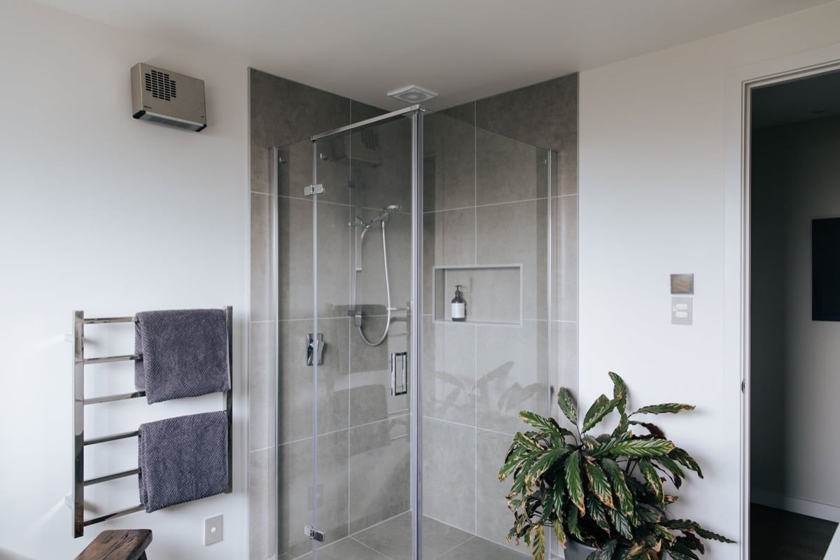 - A heated towel rail was fitted to the wall between the bath and shower to be accessible for both fixtures. A fan heater was installed above. Under-tile electric heating was installed. LED downlights are used for lighting, including as task lighting above the vanity. The mirrored cabinet was fitted with a double plug inside the cabinet, to allow items such as electric toothbrushes to be charged out of site and leave the vanity surface free of clutter.