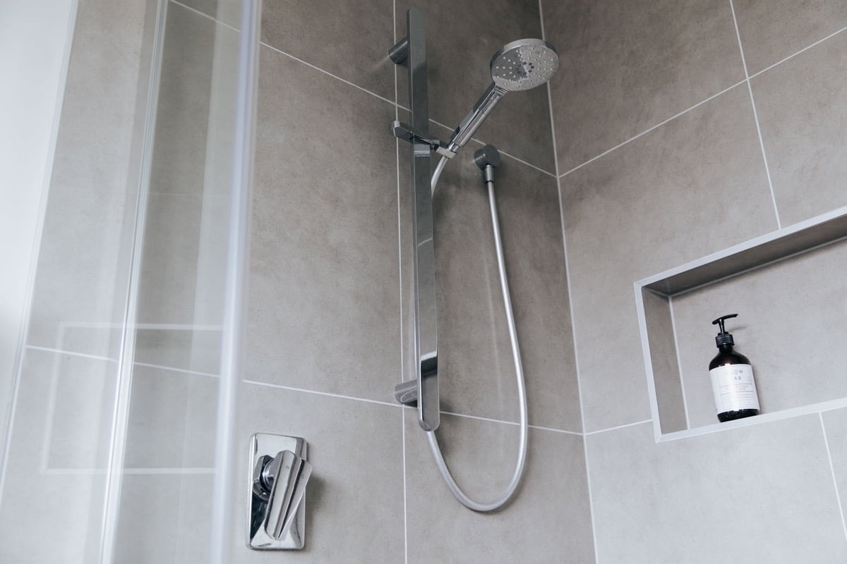 - The bathroom includes a tiled shower, toilet, vanity and free-standing bath. A 1,800mm long free-standing corner bath was selected to avoid any dead space at either end of the bath. A 1,000mm square tiled shower was installed opposite the bath.