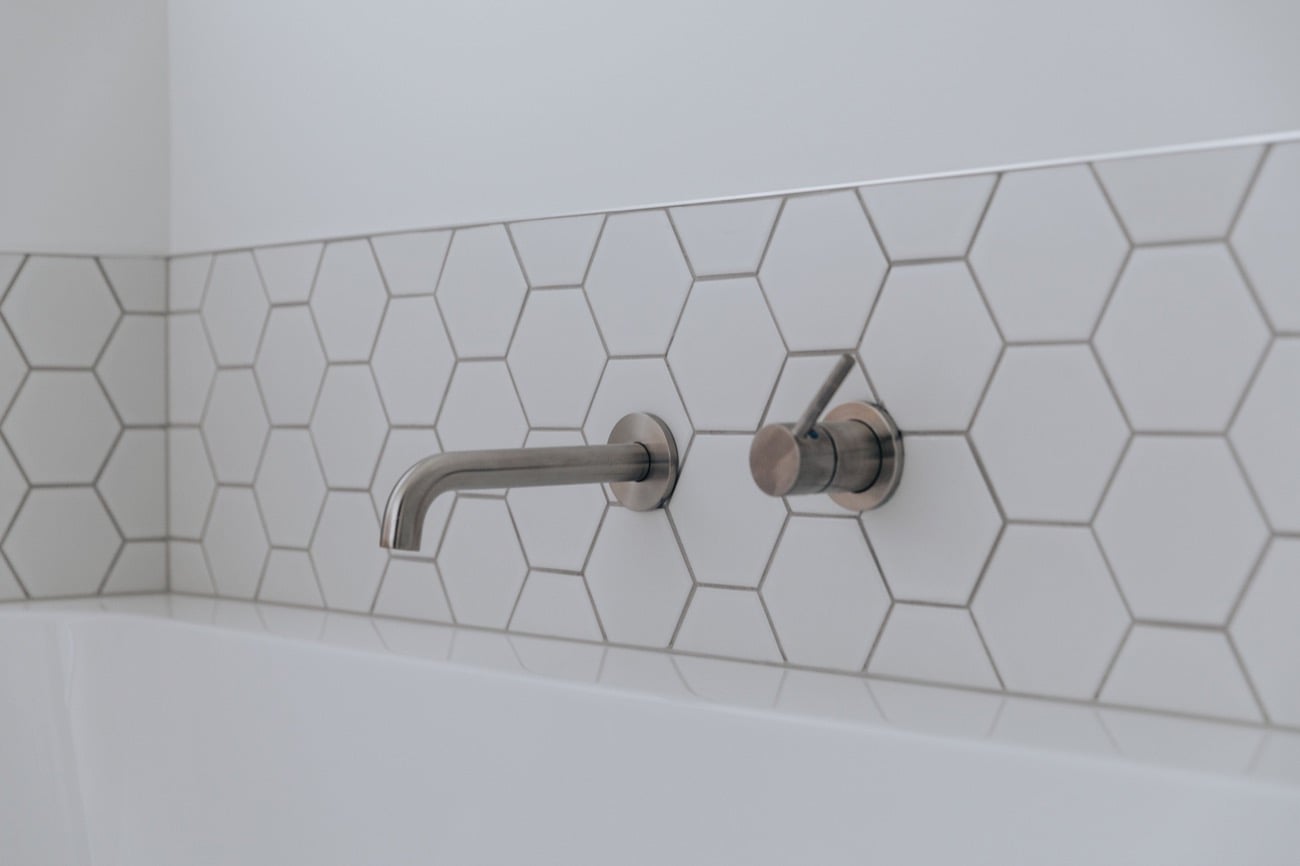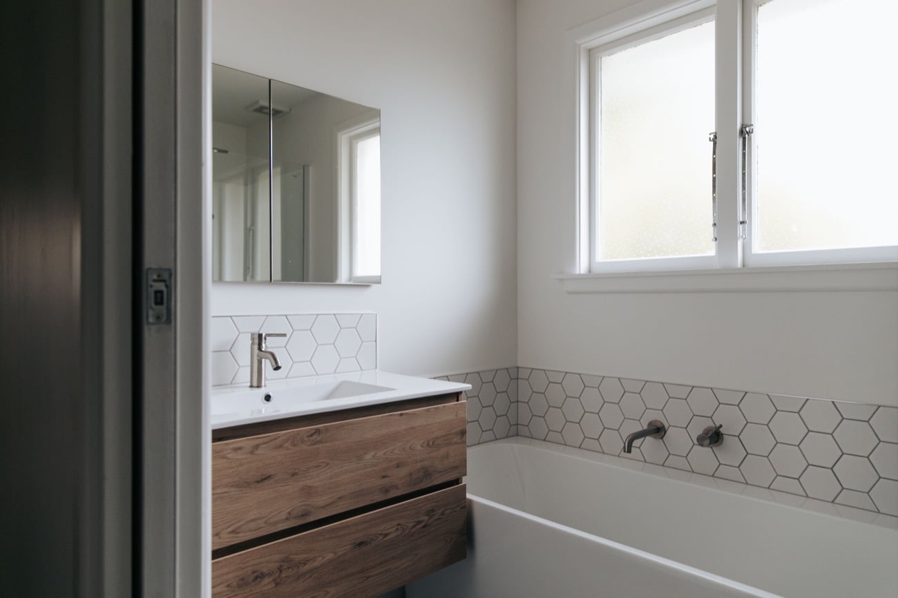 - A wall-hung vanity was used to maximise the apparent floor space. The vanity was constructed from a standard carcass fitted with a custom timber top.