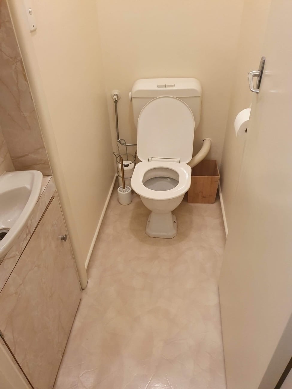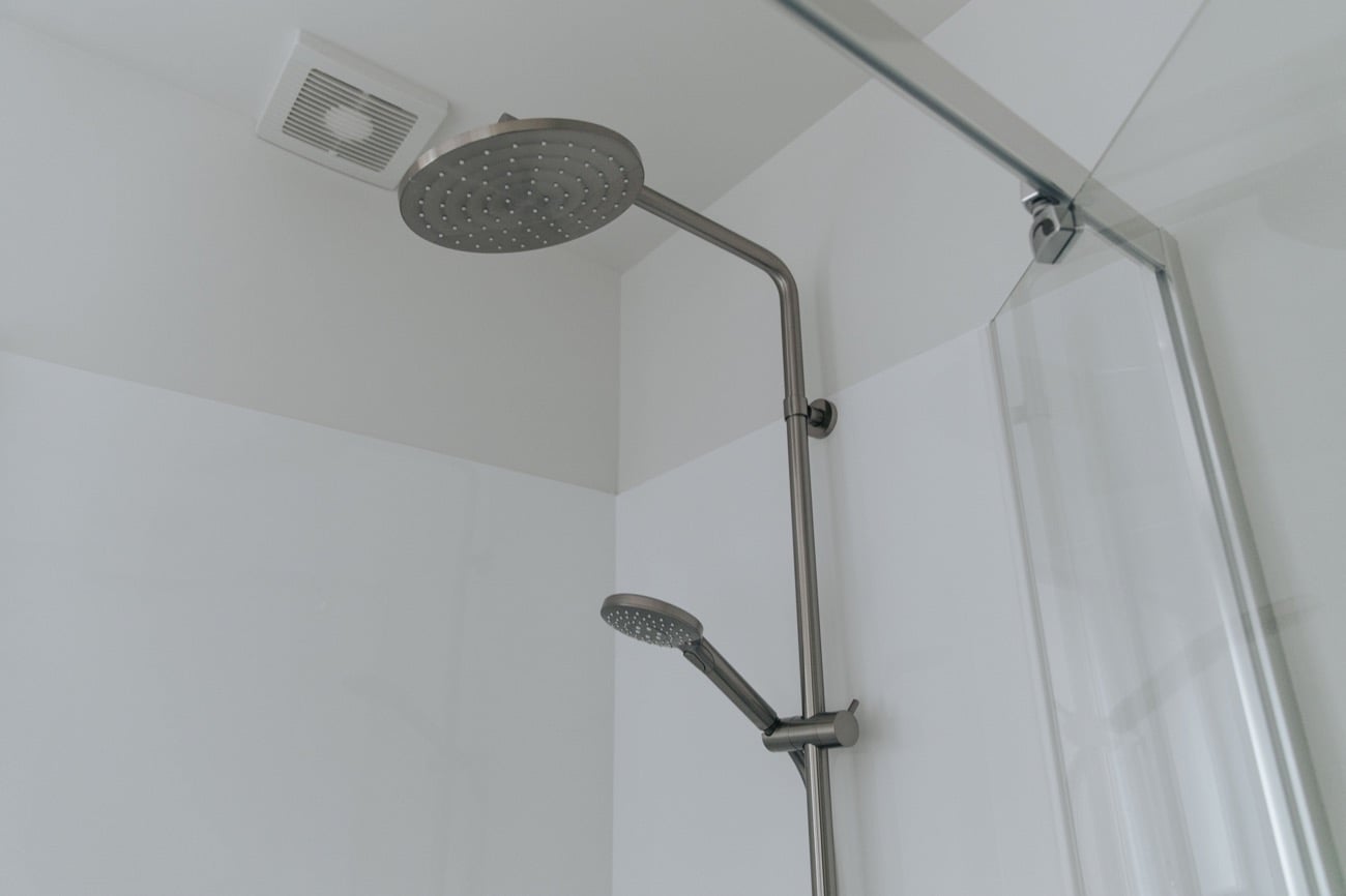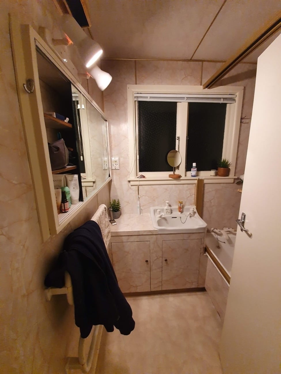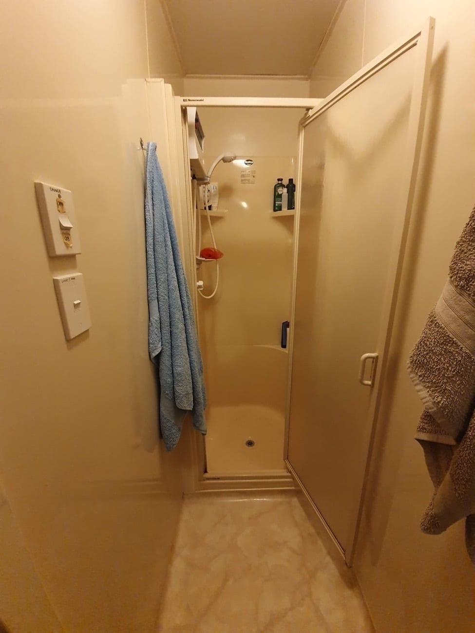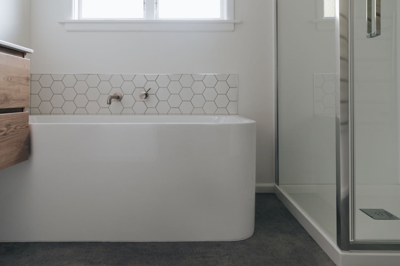 - A tiled floor with under-floor heating was installed, and a tiled shower installed the full width of the bathroom, with small alcoves fitted between the existing studs.