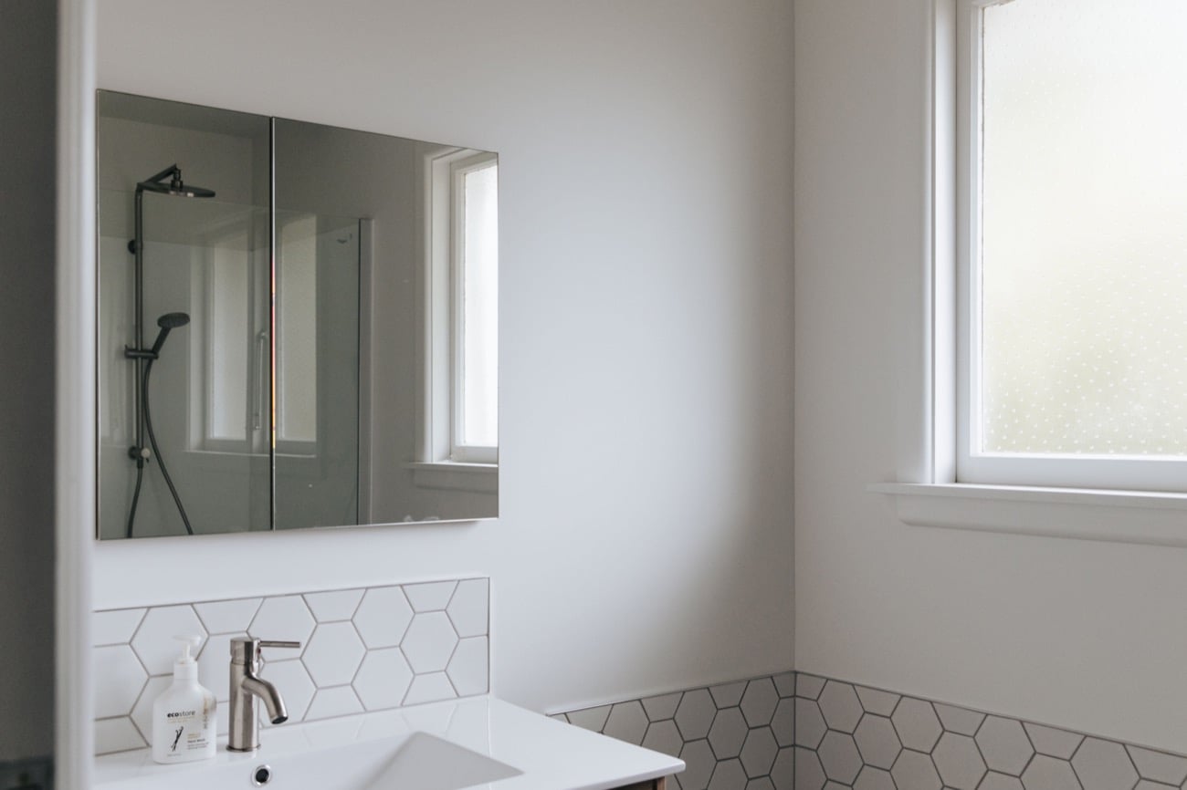 - The bathroom doorway was converted to an internal cavity slider system and the original door (an original Rimu door) was reused as the sliding door.