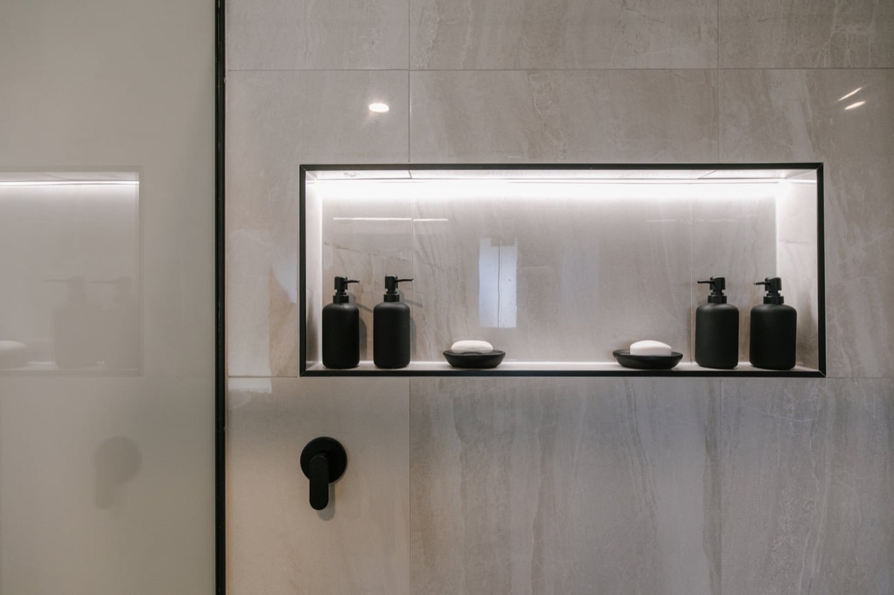 - The fittings have a black finish which is complemented by the black tile trim.