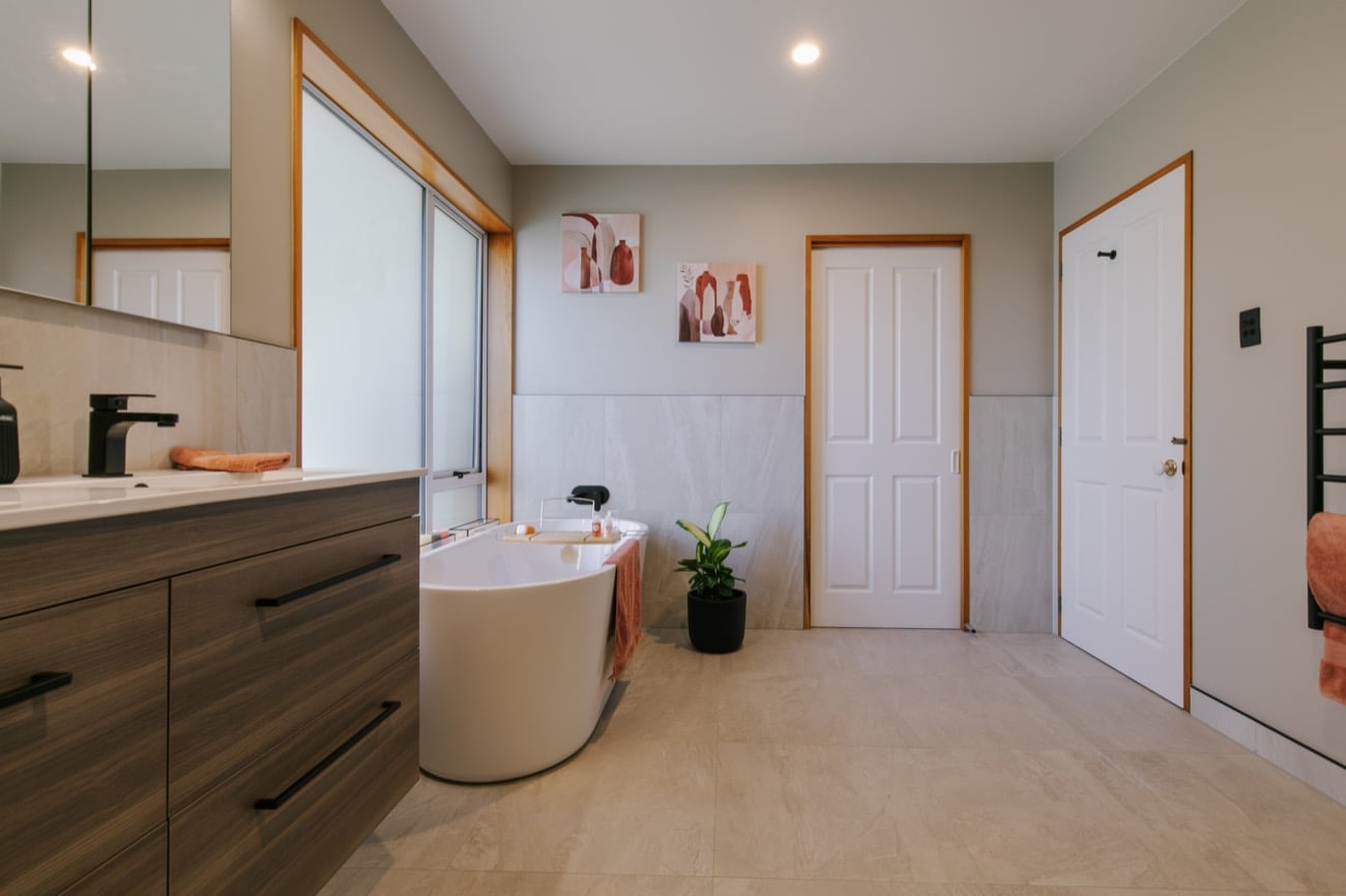 - Fully freestanding bath which negates the lower window sill height that threatened to have a negative impact on the floor layout.